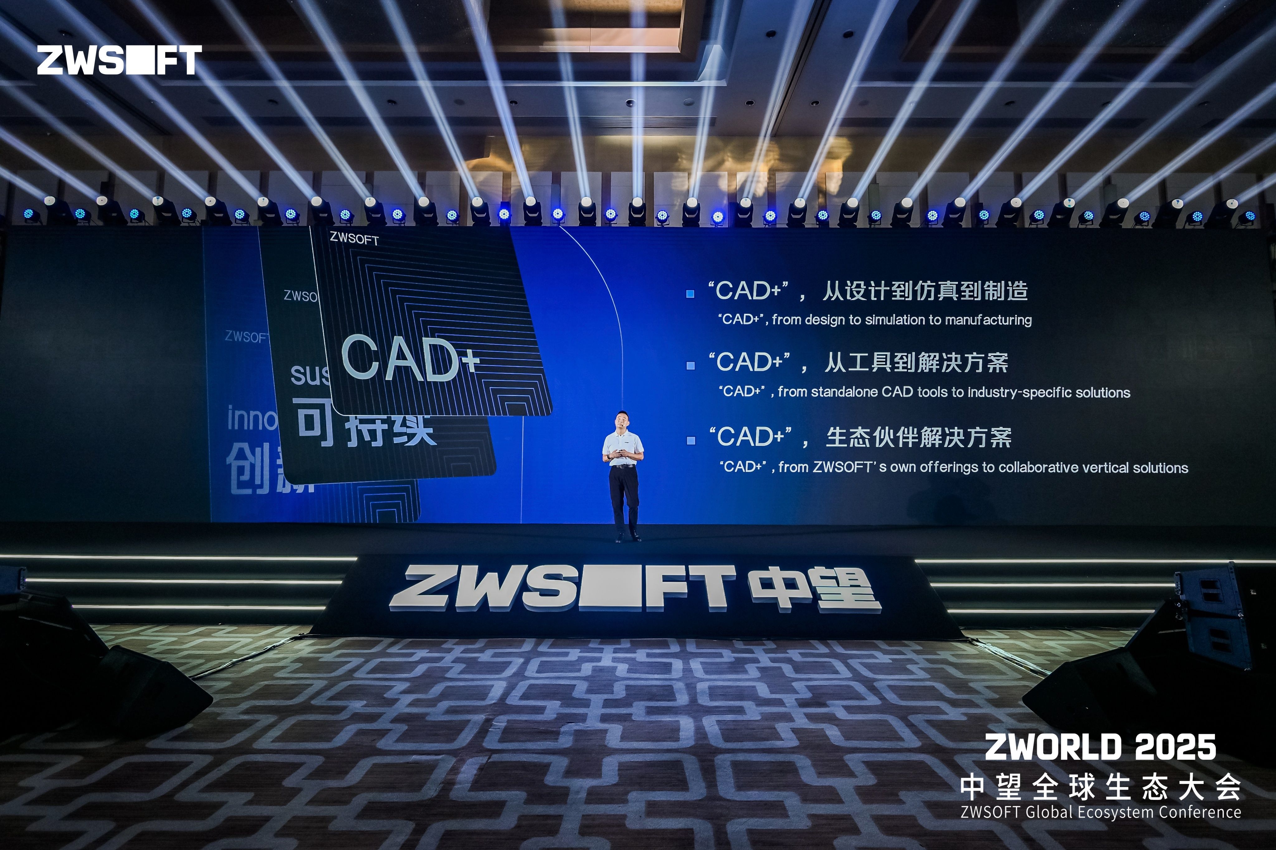 “持续创新不仅是企业的战略选择,更是驱动工业进化的核心动力。”杜玉林董事长在《CAD+,推动工业可持续创新》演讲中强调:“加速数字世界与物理世界的融合共生,赋能组织与个人的可持续创新,是中望与所有伙伴共赢发展的基石。我们以‘CAD+’为技术支点,携手生态伙伴构建深度适配行业场景的解决方案,持续为客户创造价值。”