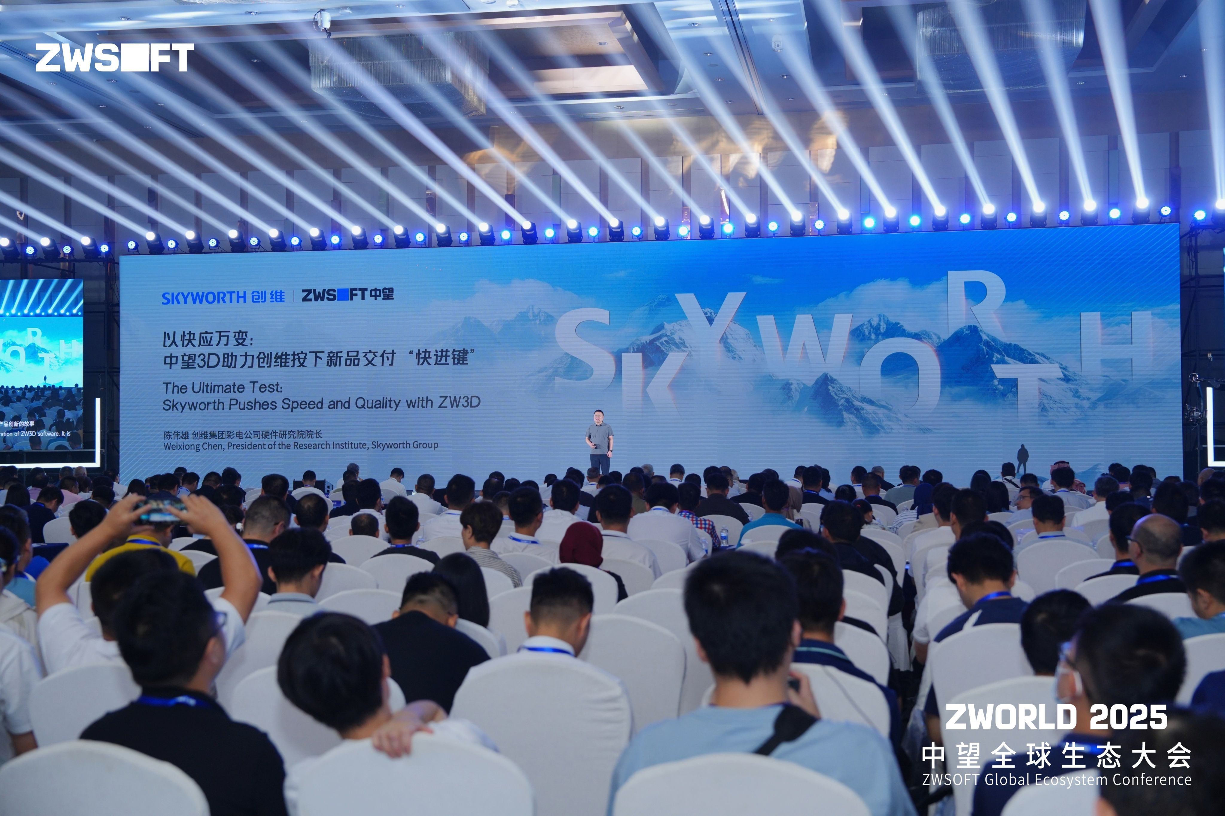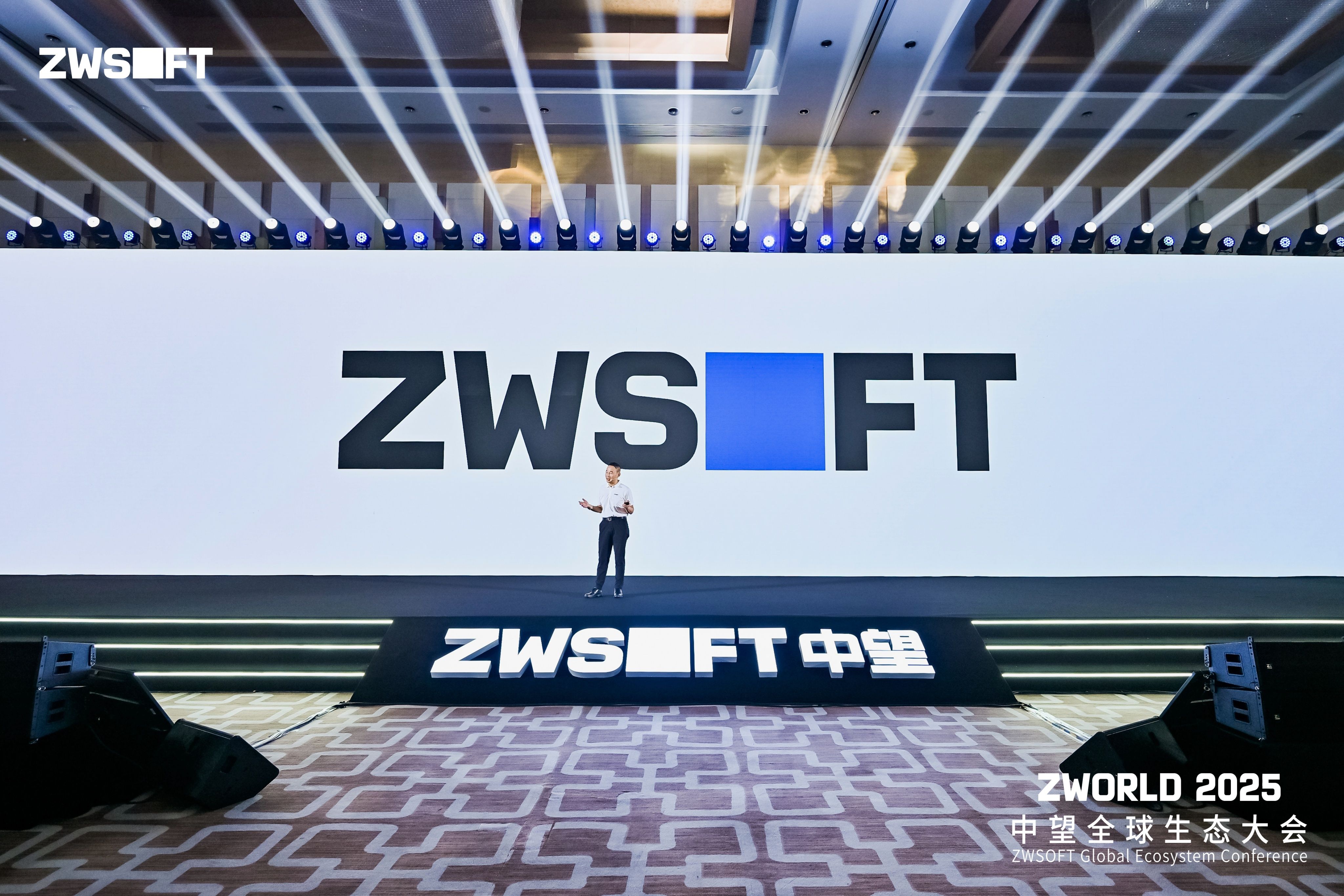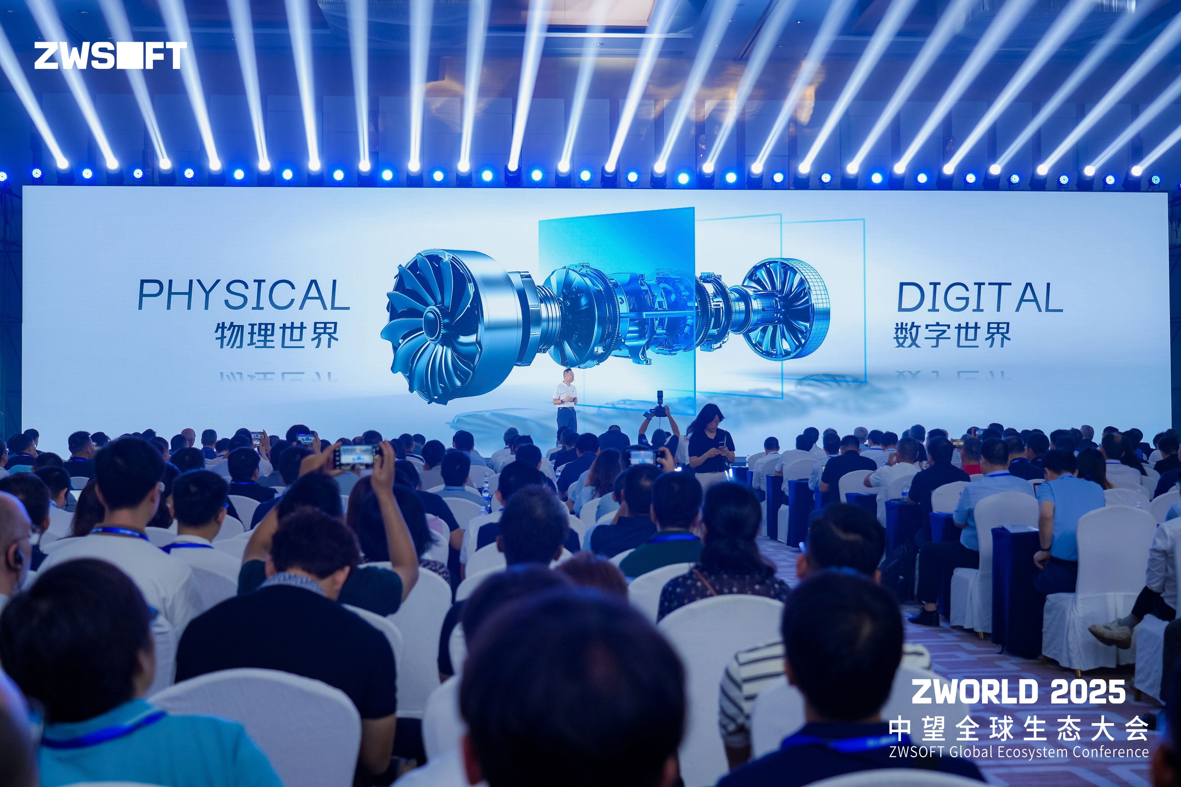 随后,杜玉林董事长代表公司面向全球伙伴正式发布中望新LOGO。“新LOGO不仅是一次视觉进化,更是对中望战略、品牌定位的全新升级!成立27年,中望站在一个新起点上,重新再出发。这是一种态度,一种决心。”杜玉林介绍,新LOGO创意性地将“ZWSOFT”中的字母“O”替换为蓝色方块,寓意“数字之窗”,象征着公司以工业级稳定性为基础,推动数字技术与物理世界深度融合的全新使命。“新标识中的蓝色方块,象征着中望构建的数字孪生桥梁。我们正通过自主核心技术,实现数字世界与物理世界的深度耦合,构建可持续的创新闭环。”