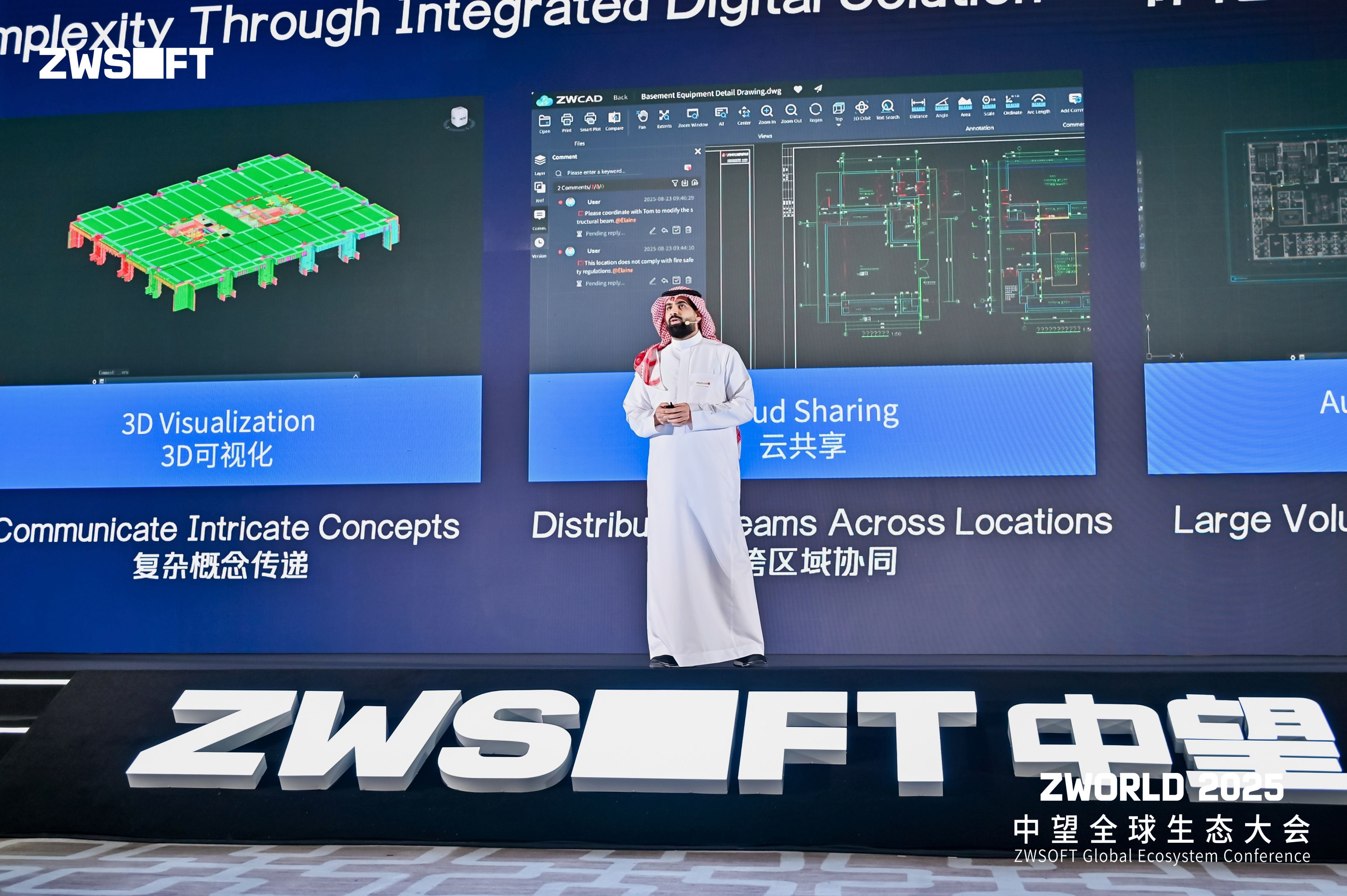 中望海外企业客户代表也分享了多个具有代表性的实践案例:土耳其Temren Makina机械设计工程师Burak Ramazan Güngör讲述了“在最严酷的环境中保持机动性”的工程创新故事;沙特Zaid集团展示了通过阿卜杜拉国王国际花园工程践行绿色未来的实践,将生态理念与数字创新完美结合。