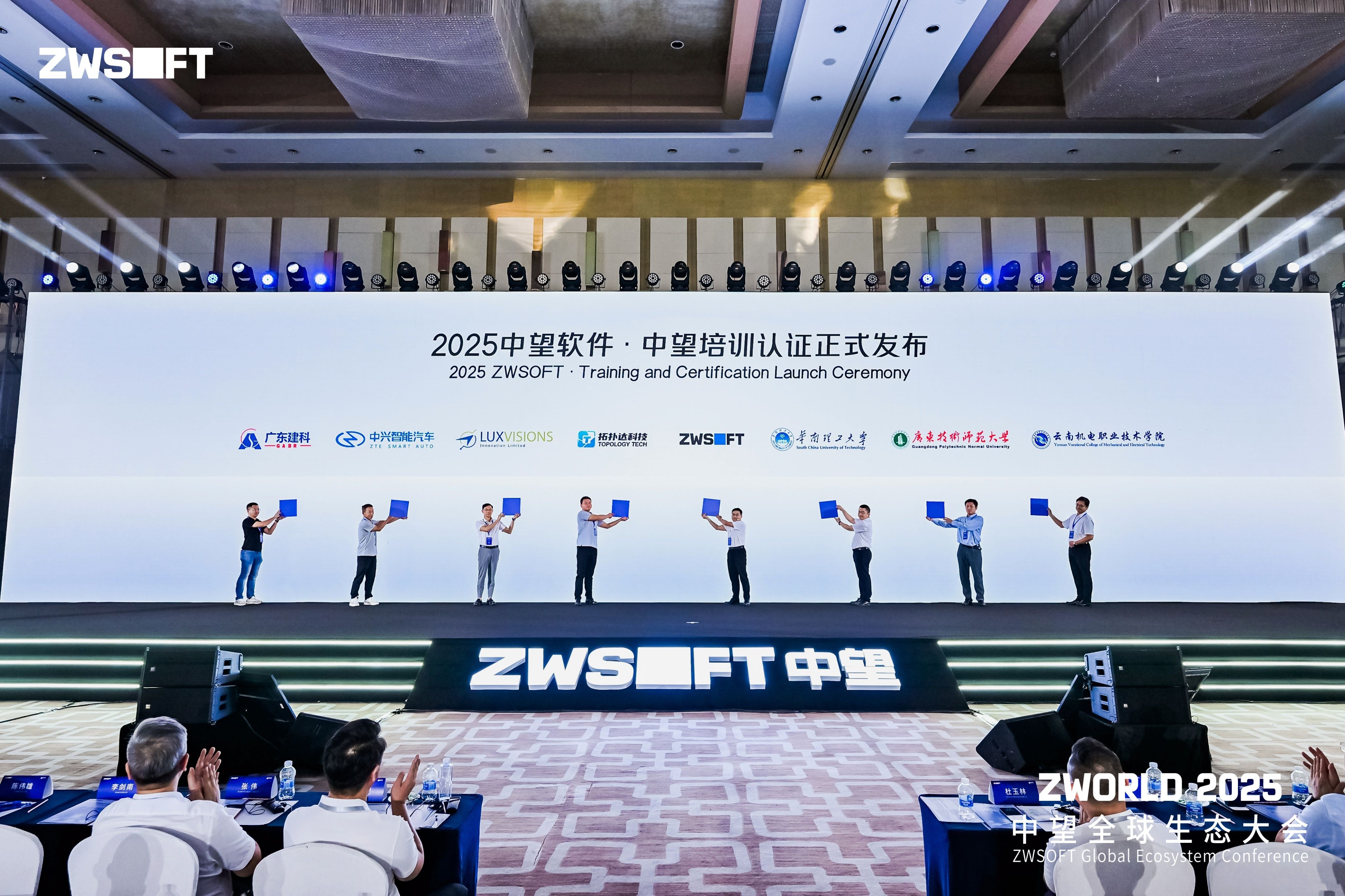 大会上,中望软件正式发布了中望认证培训体系,以更好地助力企业应对研发设计人才挑战,为产业高质量发展提供人才支撑。该体系致力于协助院校培养与行业需求高度契合的专业人才,为企业提供权威、统一的技能评估标准,推动教育端、产业端与人才端的多方共赢。广东省建筑科学研究院集团股份有限公司、中兴智能汽车有限公司、立景创新科技股份有限公司、拓扑达科技(北京)有限公司、华南理工大学、广东技术师范大学、云南机电职业技术学院等企业及院校嘉宾与中望软件副总经理王长民一起参加了发布仪式。